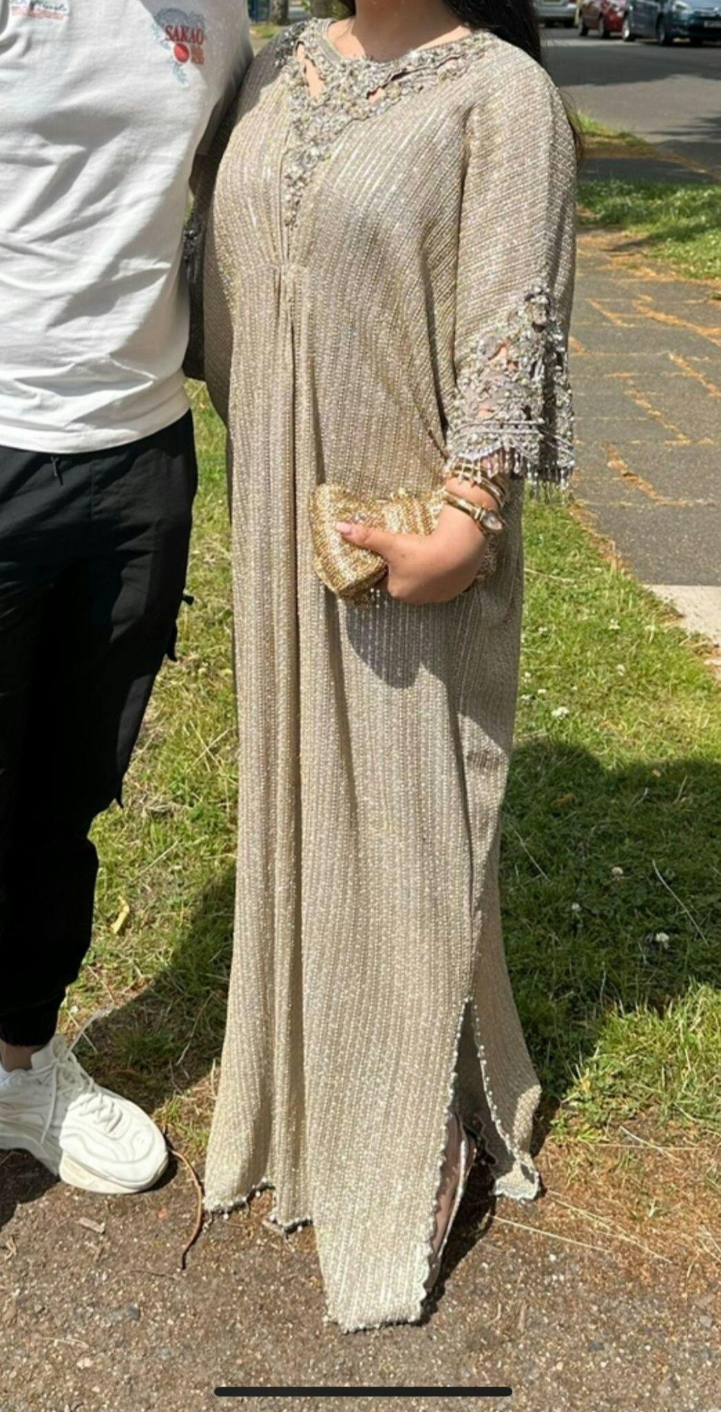 نقدم لكم إضافةً رائعةً أخرى إلى سلسلة قفطانات ريجاليا: جوهرةٌ مصنوعةٌ يدويًا بإتقان. هذا القفطان مزينٌ بأحجار سواروفسكي المتقنة وخيوط زاري على خط العنق والأكمام، جميعها مصنوعةٌ من شيفون الترتر النقي. إنه الخيار الأمثل للمناسبات الاحتفالية، حيث يمزج بين التواضع والأناقة العصرية.